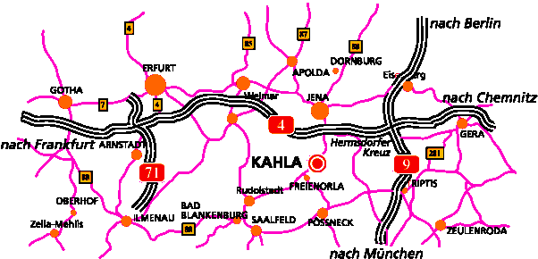 Die Autobahn A4 verlassen Sie in Jena an der Abfahrt Jena-Göschwitz und fahren auf der B88 nach Kahla. Nach 8 km erreichen Sie Kahla. Hier richten Sie sich bitte nach den grünen Hotel-Hinweisschildern mit der Aufschrift "Hotel zum Stadttor".